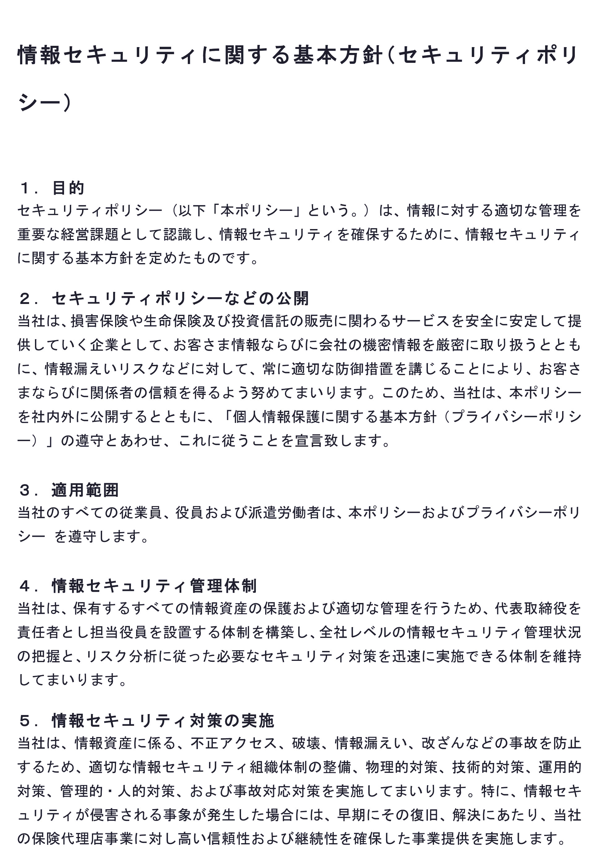 当社は、個人情報保護の重要性に鑑み、また、保険業や金融業に対する社会の信頼をより向上させるため、お客様の個人情報を適正に取り扱うことを宣言いたします。