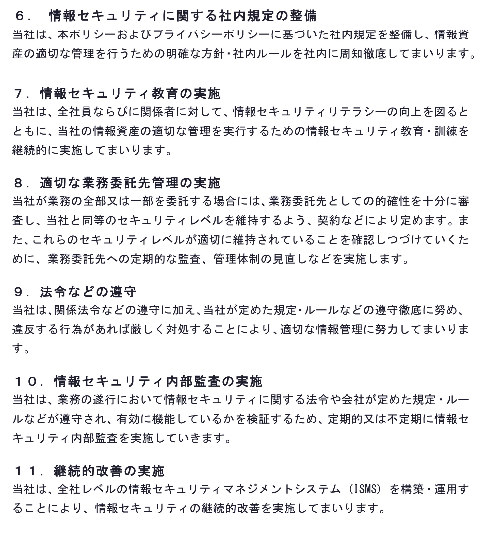 当社は、取扱う個人データ(下記(9)の個人番号および特定個人情報を含みます。また、当社が取得し、または取得しようとしている個人情報であって、個人データとして取り扱われることが予定されているものを含みます。)の漏えい、滅失またはき損の防止その他の個人データの安全管理のため、安全管理に関する取扱規程などの整備および管理体制の整備など、十分なセキュリティ対策を講じるとともに、利用目的の達成に必要とされる正確性・最新性を確保するために適切な措置を講じます。